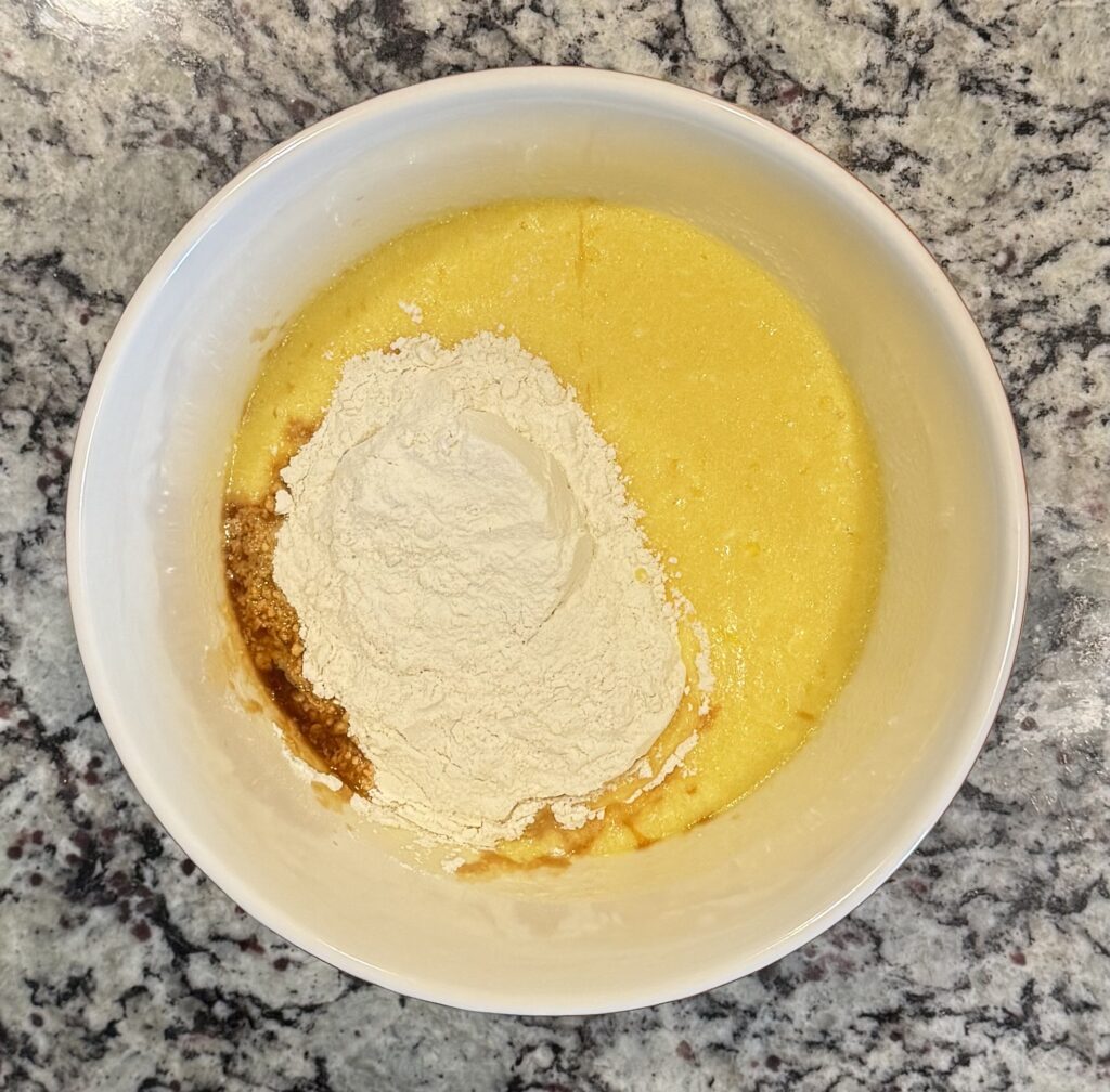Let’s get started! First melt the butter in the small microwavable dish and set aside so it can cool for a few minutes. Then beat the eggs with an electric hand mixer until foamy. Add in the melted butter and sugar and beat until well incorporated. Mix in the vanilla extract.