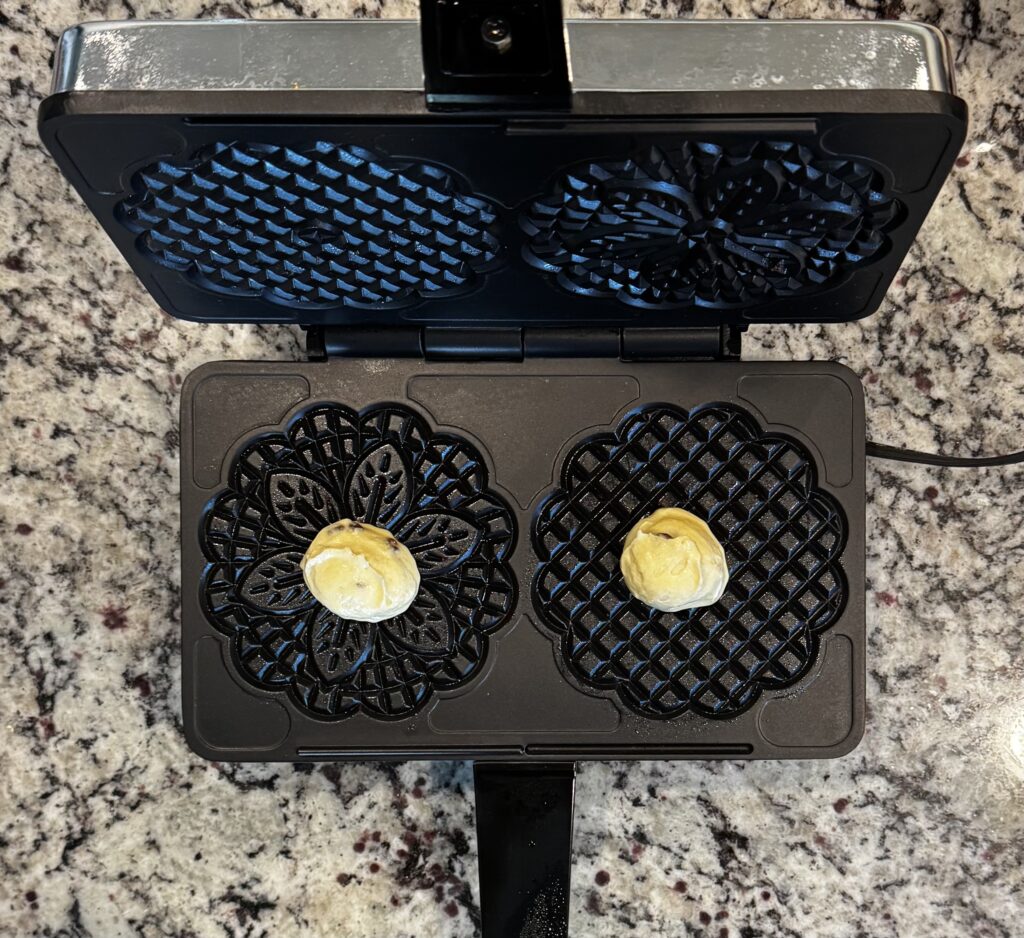 Heat your pizzelle iron or waffle iron. I wait until now to plug mine since it doesn’t take long to warm up. If yours take longer, plug when you start making the batter. Even you if you have a pizzelle iron, a waffle iron is a fun twist on the shape and texture but same taste.
