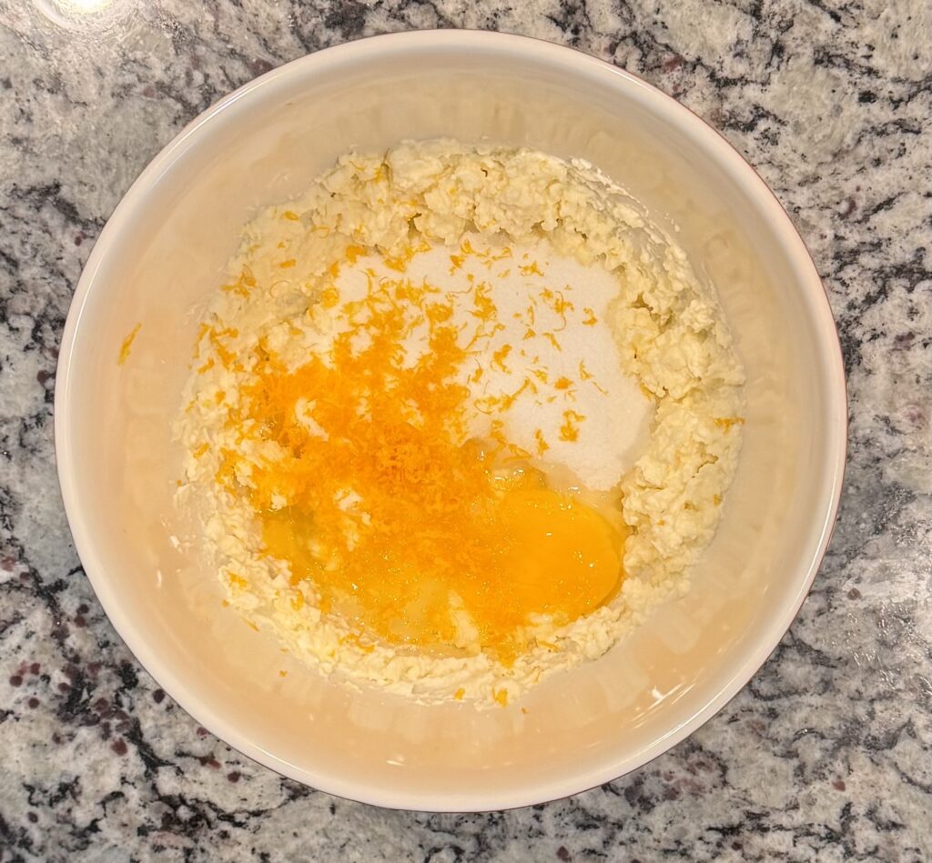 - In a large mixing bowl, beat together the butter and ricotta with a hand mixer until creamy.