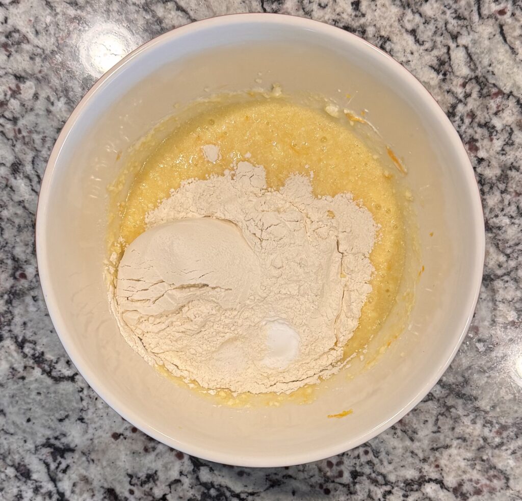 - Next beat in the granulated sugar, egg, orange extract and fresh grated orange zest (Reserving some zest for the icing).