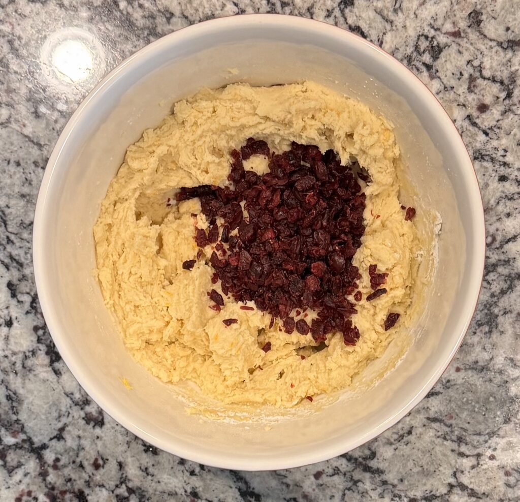 - Stir in the chopped dried cranberries.