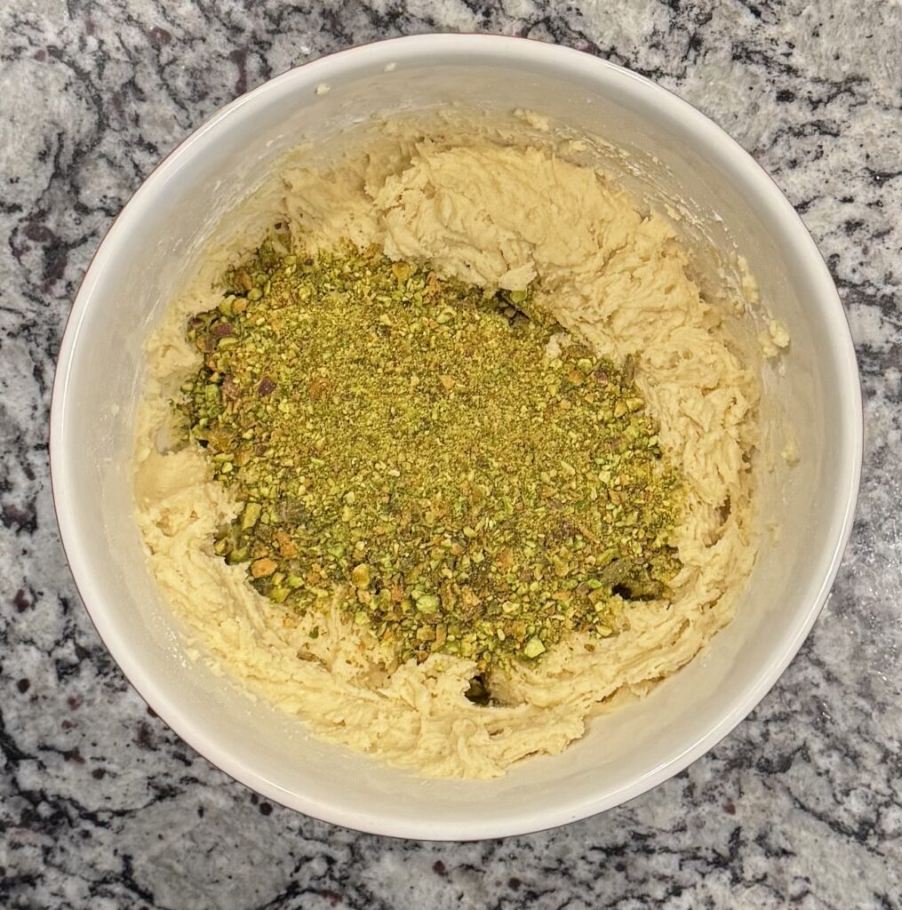 - Then mix in the finely chopped pistachios, reserving about 1/4 cup for the top.