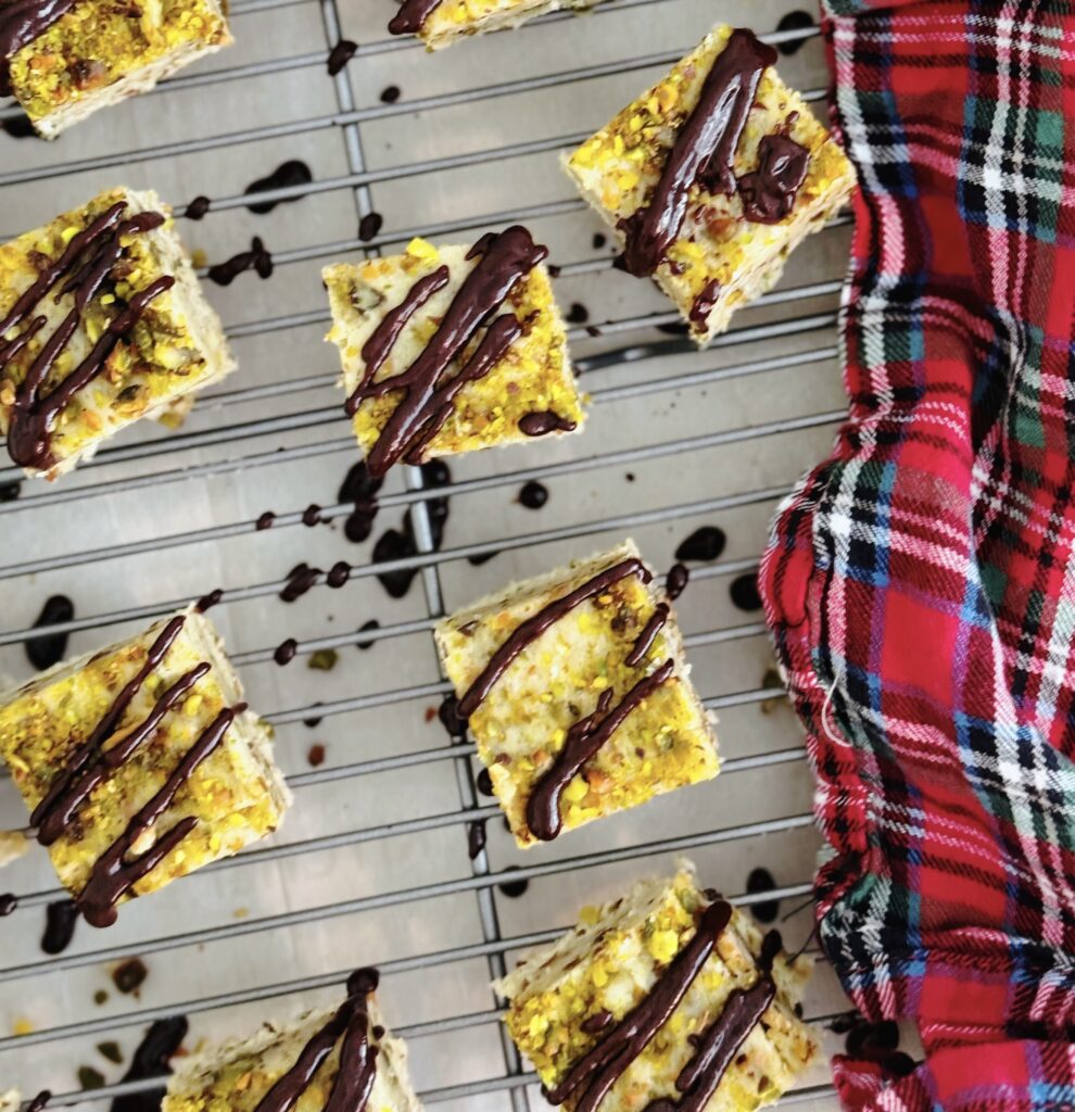 Cut into squares, serve, and enjoy the rich pistachio flavor with that luxurious chocolate finish.